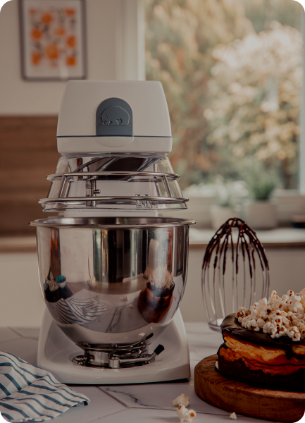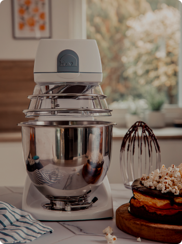 W zestawie z mikserem znajduje się 5-litrowa misa ze stali nierdzewnej wraz z pokrywą, a także trzy solidne, wykonane ze stali nierdzewnej narzędzia: trzepaczka z drutu o średnicy 2,5 mm, hak do ciasta oraz mieszadło. Dzięki temu TEDDY radzi sobie z szerokim spektrum zadań — od ubijania bitej śmietany i piany z białek, przez wyrabianie różnego rodzaju ciast, aż po mieszanie ciężkich mas i kremów. Wszystkie akcesoria można bezpiecznie myć w zmywarce, co znacznie ułatwia utrzymanie higieny.
